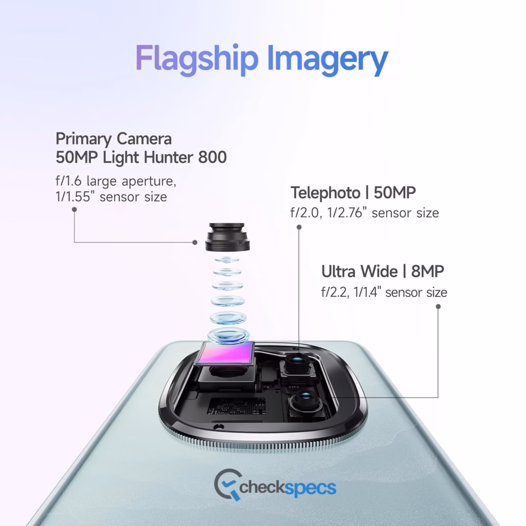 | Rear Camera | 50MP (Primary) + 50MP (2.5x Telephoto) + 8MP (Ultra-wide) |